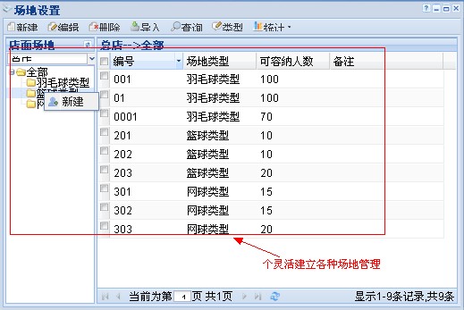 (1) 商家可以設定不同的場地類型,不同場地類型掛靠不同消費項目,各個場地類型下劃分若干個場地。