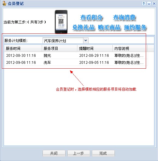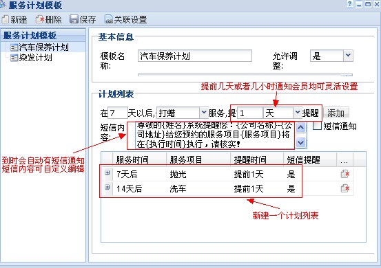 如汽車4S店的定期保養、年檢提醒和保險續費提醒;健身行業的定期健身提醒;美容美發行業的燙染后護理提醒等等,均可采用‘服務計劃’功能,以提高對顧客的服務質量,讓軟件代替人工,自動化的做售后服務。
