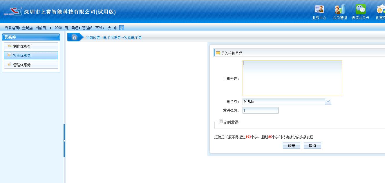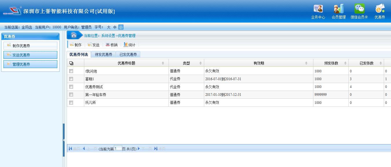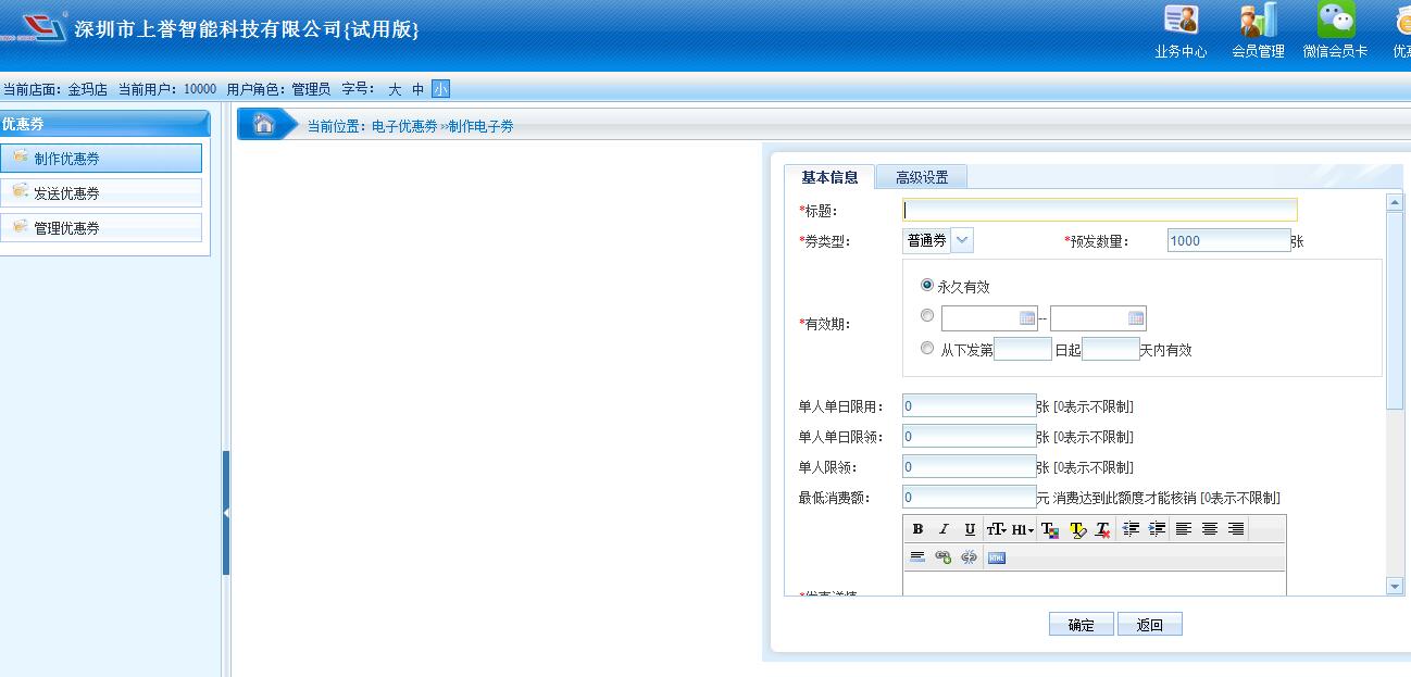優惠券功能有:制作優惠券、發送優惠券、管理優惠券等等,用于管理優惠活動證券打折等消息在第一時間內發送到客戶的手機中,讓顧客在第一時間里知道貴店最新優惠情況。 如何制作優惠券