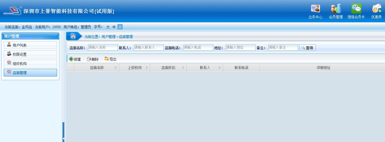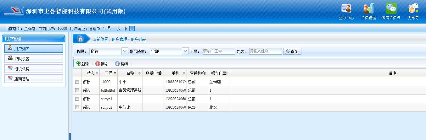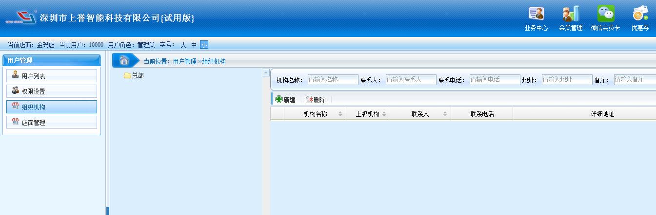 用戶管理功能有:用戶列表、權(quán)限設(shè)置、組織機(jī)構(gòu)、店面管理等等。 用戶列表:用于會員管理設(shè)置分賬號使用。
