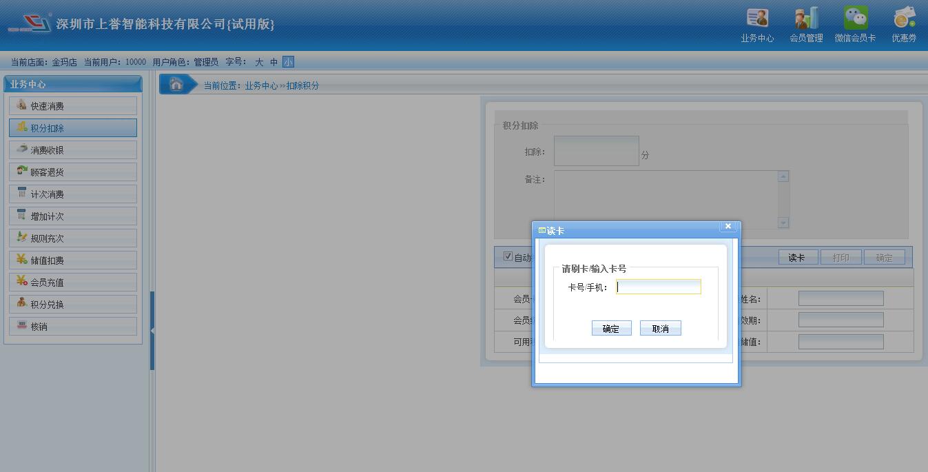 會(huì)員管理功能有:快速消費(fèi)、積分扣除、消費(fèi)收銀、顧客退貨、計(jì)次消費(fèi)、增加計(jì)次、規(guī)則充次、儲(chǔ)值扣費(fèi)、會(huì)員充值、積分兌換、核銷等等。