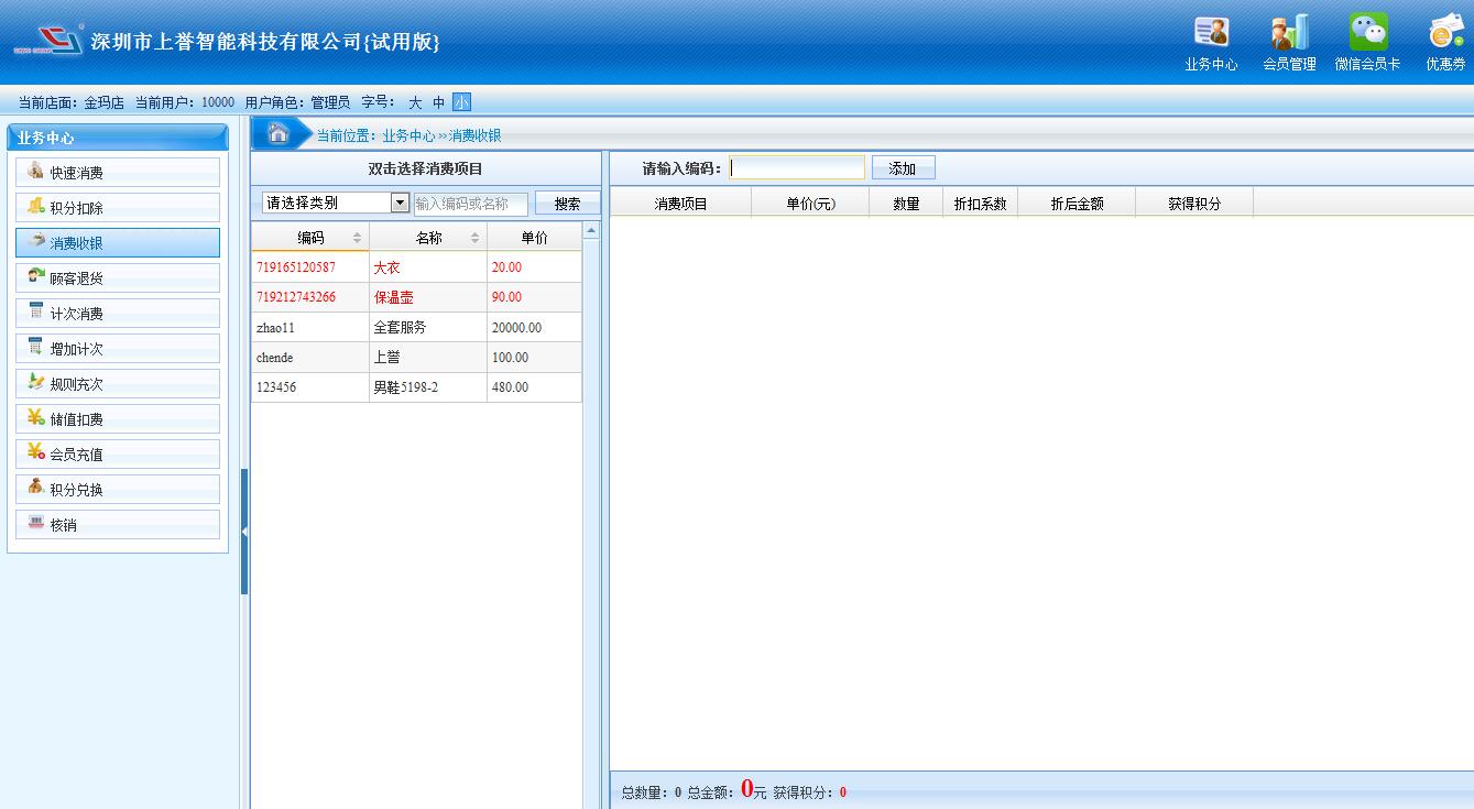 消費(fèi)收銀:用于會(huì)員在消費(fèi)中,選擇的商品以及消費(fèi)總金額的消費(fèi)收費(fèi)使用。
