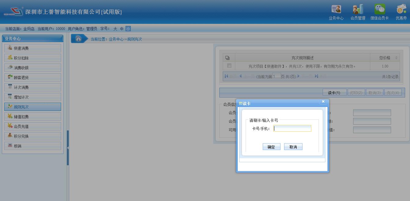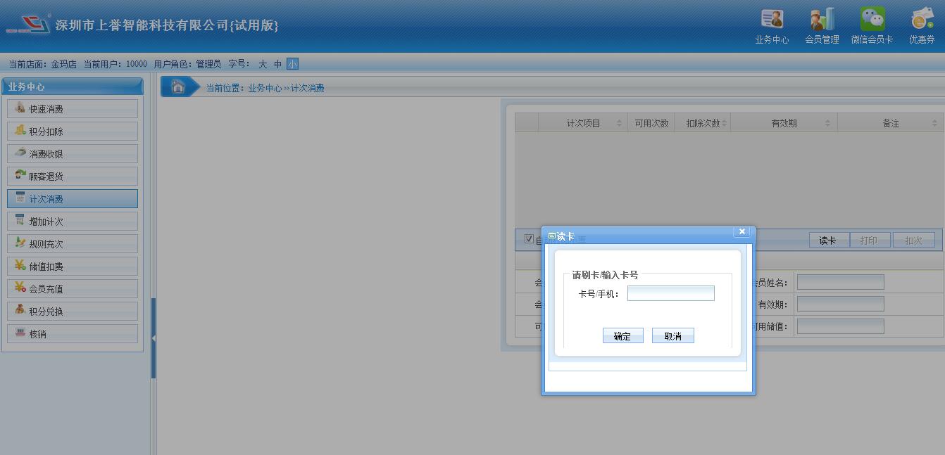 計(jì)次消費(fèi):用于部分計(jì)次會(huì)員顧客在消費(fèi)中可使用計(jì)次功能。