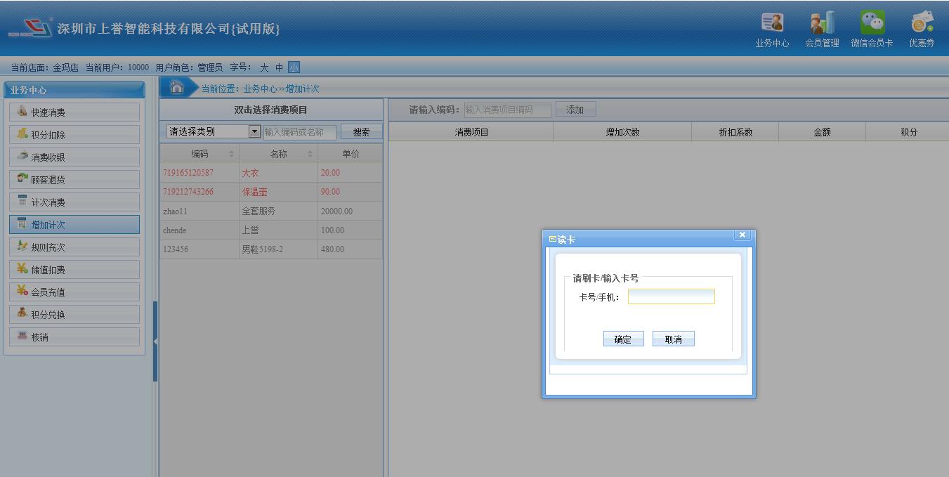 增加計(jì)次:用于商品直接增加次數(shù),增加的計(jì)次可用來消費(fèi)等。