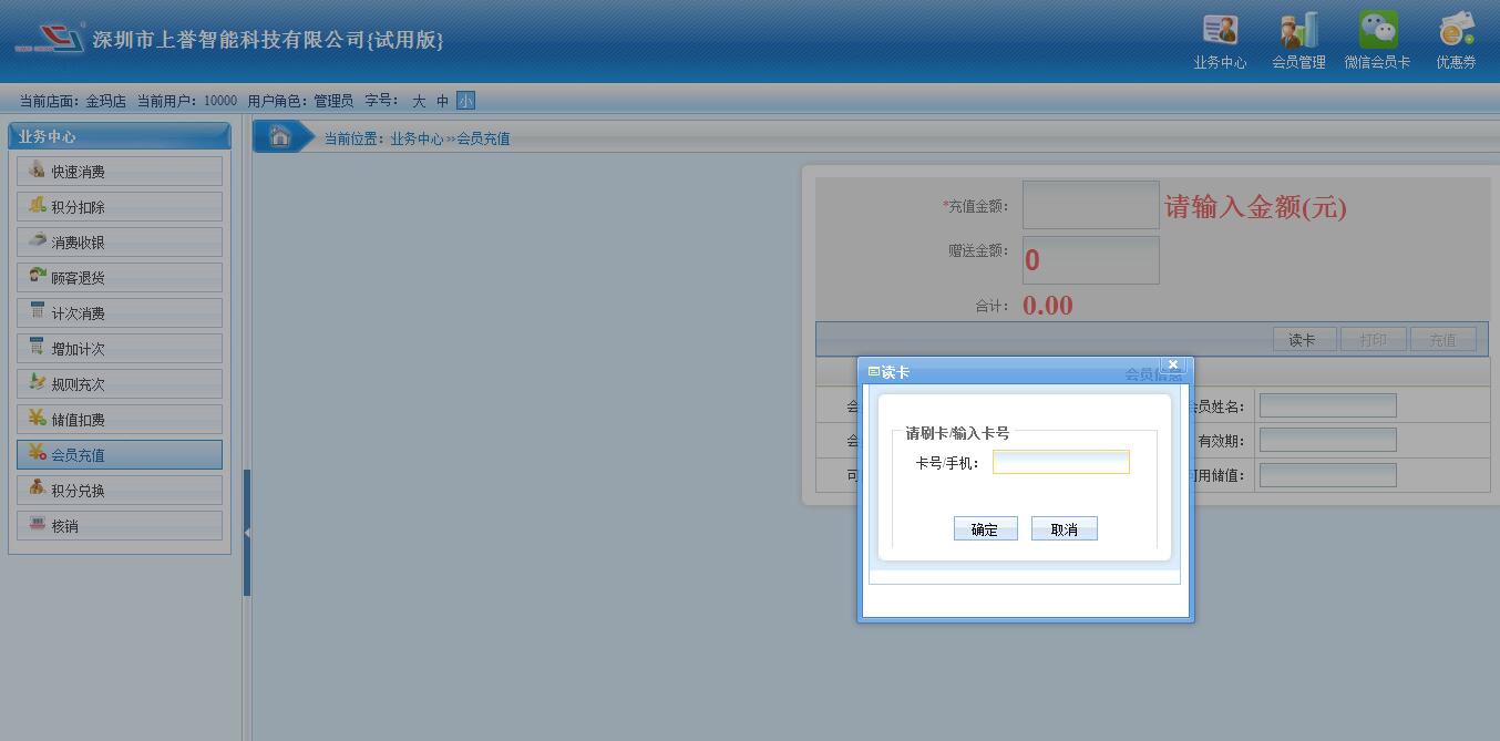會(huì)員充值:用于會(huì)員卡充值消費(fèi)功能。