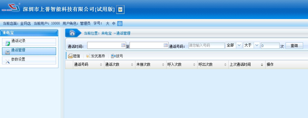 通話管理:通話管理有三小塊功能,發短信、發優惠券、撥號功能 。