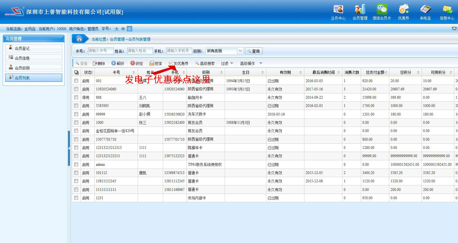 3、可以進行會員批量發(fā)電子優(yōu)惠券,會員鎖定/解鎖,以及短信過濾等功能。