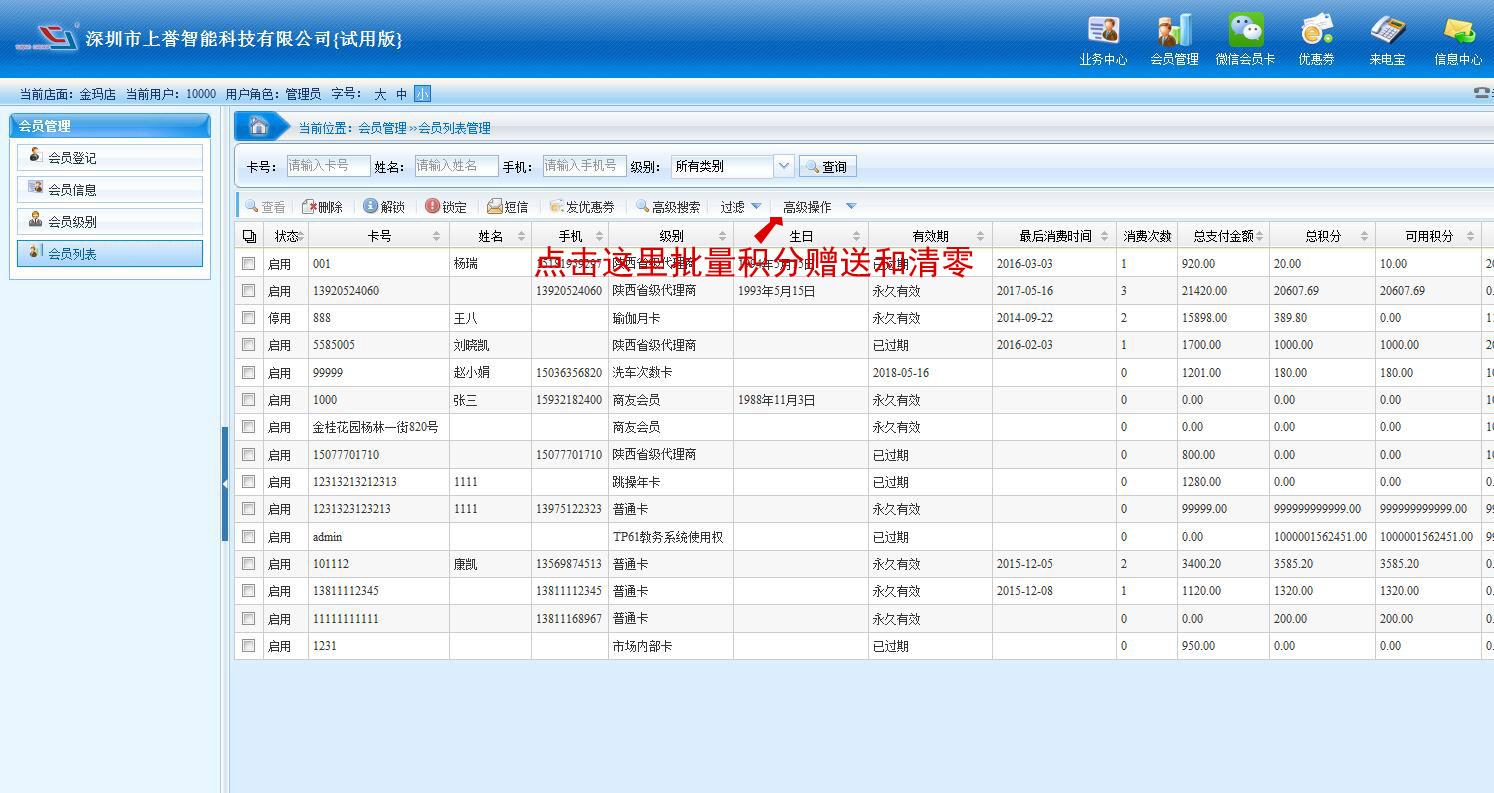 1、會員管理可查看所有會員數(shù)據(jù),也可搜索指定條件會員,批量進行積分贈送,清零,贈送儲值或計次、短信群發(fā)等功能。