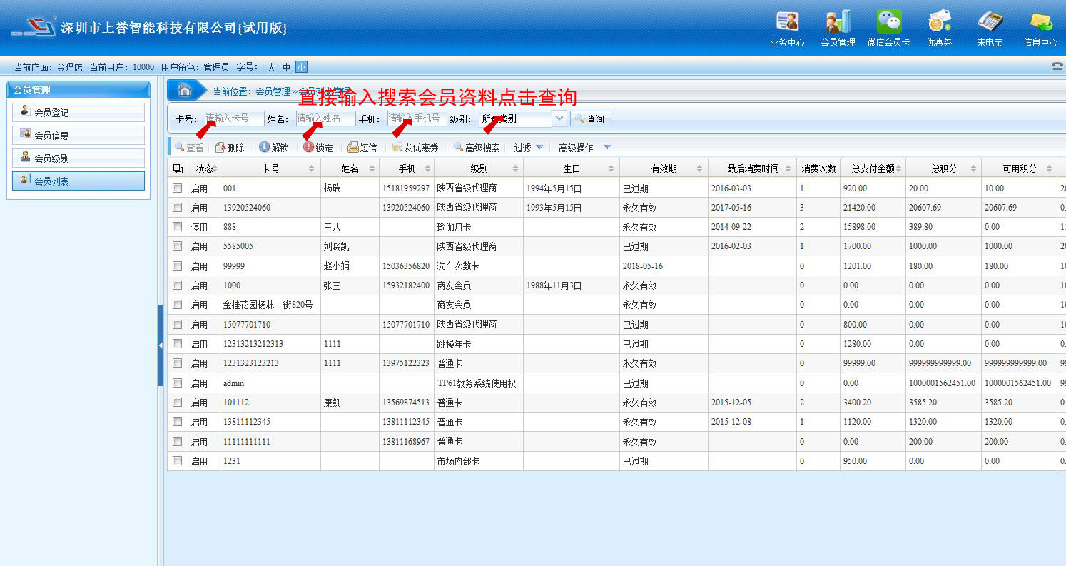 2、萬能搜索器:可按任意條件搜索查詢會員。