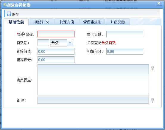會員級別用于設置各種不同級別的會員卡,包括:打折、積分和充值規則,有效期,初始儲值,初始計次和管理費等。