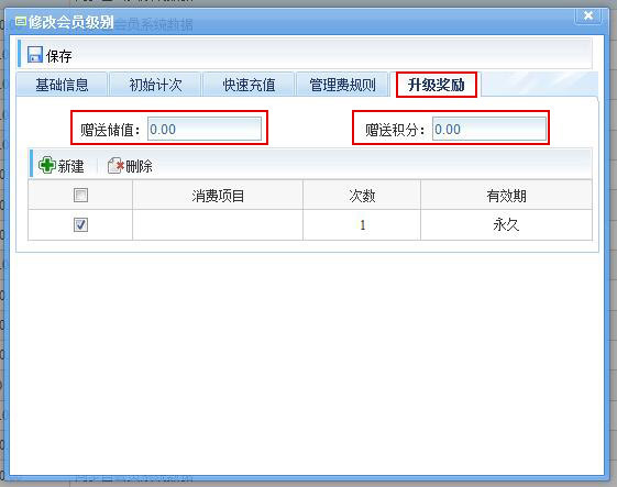 2、設定該級別會員的初始計次,可包含多個項目,每個項目均可單獨設定有效期。