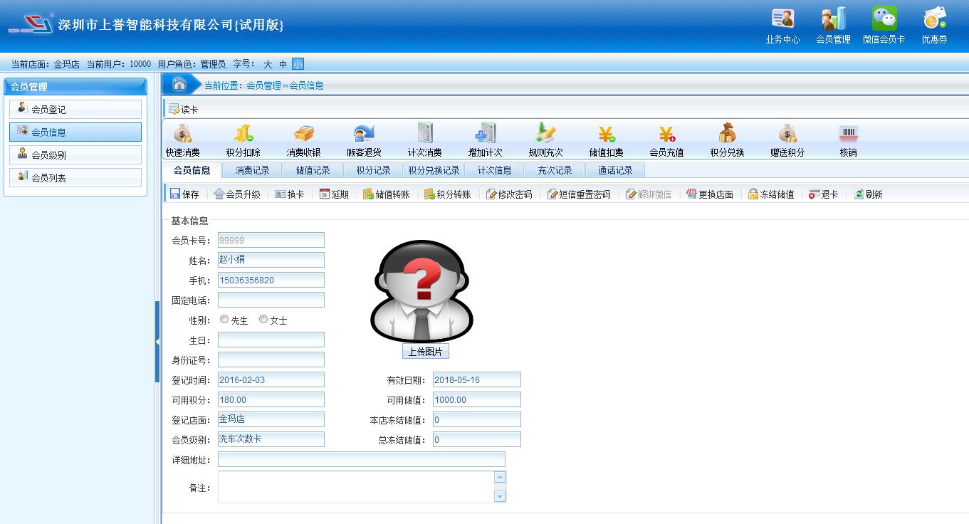 會員信息是對某個會員所有業務操作的快捷入口。 1、 會員刷卡后,可查詢該會員的全部數據和各種消費記錄以及來電記錄;還可以實現換卡、鎖定、升級、轉賬、延期、修改密碼等操作;也可直接進入積分,儲值或扣次等業務操作。 換卡:幫助會員遺失卡后可進行補卡,所有會員數據自動轉移到新卡; 升級:手動調整會員級別; 轉賬:會員之間可轉儲值與積分; 延期:延長會員卡有效期; 修改密碼:會員忘記密碼時通過短信重置密碼。