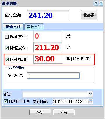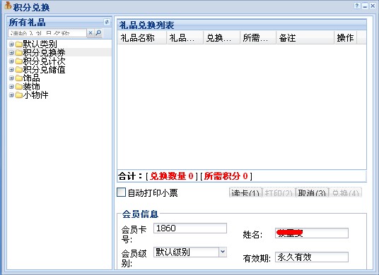 3、會員刷卡后,選擇兌換的禮品,確認后即可自動扣除相應分數(可設置是否需要會員輸入密碼)。軟件自動短信通知會員本次兌換情況,包括:兌換的禮品,扣除積分和剩余積分。