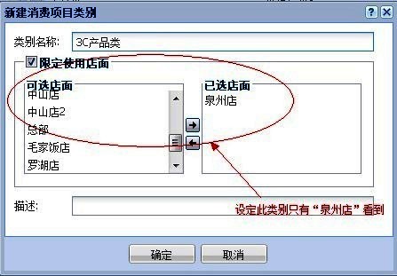 2、建立消費(fèi)項(xiàng)目類別,設(shè)置歸屬店面: