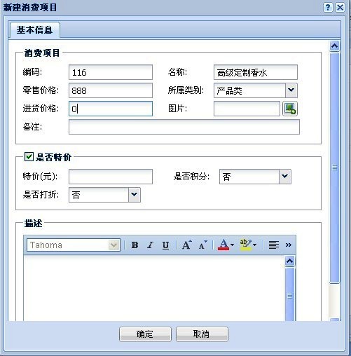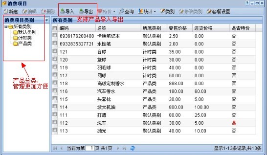 消費(fèi)項(xiàng)目是作為會(huì)員管理軟件的基本功能項(xiàng),可添加產(chǎn)品并設(shè)置產(chǎn)品類別,價(jià)格,折扣規(guī)則,積分規(guī)則,以及是否為特價(jià)商品等。